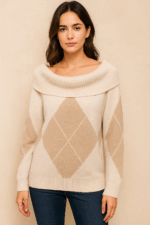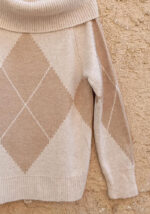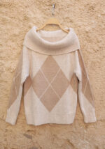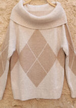 Η πλεκτή μπλούζα Oxford σε εκρού συνδυάζει κλασικό μοτίβο και σύγχρονη κομψότητα. Με μοτίβο ρόμβων (argyle) σε αποχρώσεις εκρού και μπεζ, αυτό το πλεκτό είναι ιδανικό για cozy εμφανίσεις με διαχρονικό χαρακτήρα. Η φαρδιά ριχτή λαιμόκοψη μπορεί να φορεθεί είτε έξω από τον ώμο είτε κλασικά, προσφέροντας ευελιξία στο styling. Άνετο, μαλακό και ευκολοφόρετο, ταιριάζει τέλεια με τζιν, παντελόνια ή φούστες για ένα σοφιστικέ καθημερινό look.