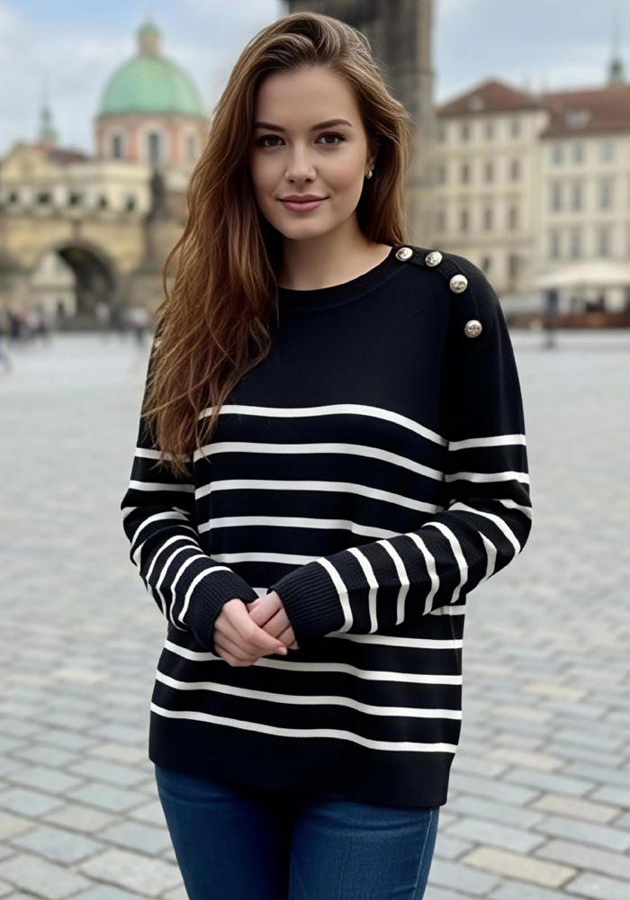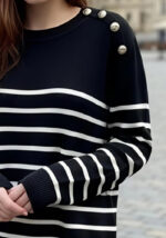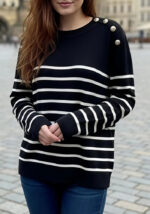 Το ριγέ πλεκτό Navona αποπνέει διαχρονική κομψότητα και effortless στυλ. Με μαύρο χρώμα, λευκές οριζόντιες ρίγες και διακοσμητικά κουμπιά στους ώμους, προσφέρει ένα chic αποτέλεσμα που ταιριάζει σε κάθε περίσταση. Η μαλακή υφή του και η ελαστική εφαρμογή του εξασφαλίζουν άνεση όλη την ημέρα — ιδανικό τόσο για το γραφείο όσο και για casual βόλτες. Συνδύασέ το με jeans, tailored παντελόνι ή φούστα για ένα polished look με διακριτικό χαρακτήρα.
