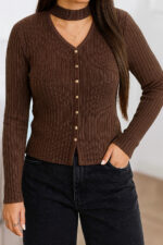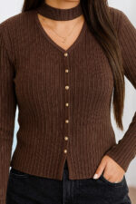 Αυτό το καφέ πλεκτό μπλουζάκι με κουμπιά Bottoni αποτελεί την ιδανική επιλογή για κομψές, καθημερινές εμφανίσεις. Το ανάγλυφο πλέξιμο χαρίζει ζεστασιά και στυλ, ενώ η εφαρμογή του συνδυάζει άνεση με θηλυκή γραμμή. Μπορεί να φορεθεί πάνω από ένα basic τοπ για layered looks που ξεχωρίζουν.