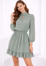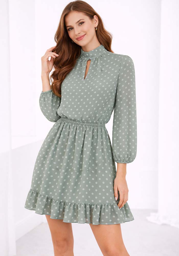 Ρομαντικό mini φόρεμα Cordelia σε μέντα απόχρωση με διακριτικό λευκό πουά μοτίβο, σχεδιασμένο για θηλυκές και κομψές εμφανίσεις. Η αέρινη γραμμή και η ελαφριά υφή του υφάσματος δημιουργούν φυσική κίνηση, ενώ το δέσιμο στον λαιμό προσθέτει refined, vintage-inspired χαρακτήρα. Η μακριά μανσέτα με ελαφρύ όγκο στα μανίκια και το βολάν στο τελείωμα ενισχύουν τη ρομαντική αισθητική του σχεδίου. Η ελαστική μέση διαμορφώνει κολακευτική σιλουέτα, καθιστώντας το ιδανικό για day-to-night εμφανίσεις.