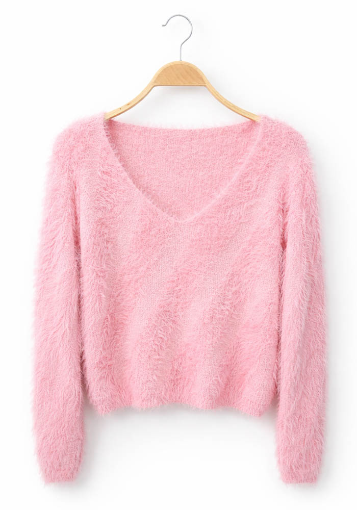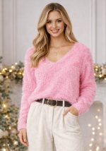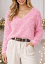- Ροζ fluffy πλεκτό με V λαιμό και ανάγλυφο σχέδιο