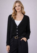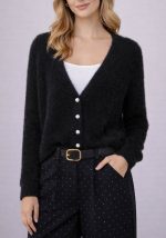 Η ζακέτα Christie σε μαύρο χρώμα αποτελεί μία κομψή και θηλυκή επιλογή knitwear με διακριτική πολυτέλεια. Η αφράτη, soft-touch υφή προσφέρει άνεση και ζεστασιά, ενώ η κοντή γραμμή αναδεικνύει τη σιλουέτα και επιτρέπει εύκολους συνδυασμούς με ψηλόμεσα παντελόνια, φούστες ή φορέματα. Τα κουμπιά από πέρλα με διακριτικά στρασάκια προσθέτουν μία elegant λάμψη και λειτουργούν ως statement λεπτομέρεια, αναβαθμίζοντας το minimal design της ζακέτας. Το V ντεκολτέ χαρίζει θηλυκό χαρακτήρα και καθιστά το κομμάτι ιδανικό τόσο για καθημερινά chic looks όσο και για πιο προσεγμένες εμφανίσεις.Ένα refined cardigan που ισορροπεί ανάμεσα στο cozy και το sophisticated, ιδανικό για layering και all-day styling.