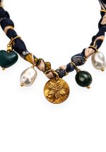 Κολιέ Nola με υφασμάτινη βάση σε printed μοτίβο και διακοσμητικά charms σε συνδυασμό μετάλλου και πέτρας. Ο ιδιαίτερος σχεδιασμός δημιουργεί ένα κομψό statement αποτέλεσμα, ιδανικό για να αναβαθμίσει καθημερινά και resort looks. Η υφασμάτινη αλυσίδα προσφέρει άνεση, ενώ τα κρεμαστά στοιχεία σε διαφορετικά σχήματα και υφές — μεταλλικό μοτίφ, διακοσμητικές πέτρες και πέρλα — προσδίδουν μοντέρνα και καλλιτεχνική αισθητική. Το ρυθμιζόμενο κούμπωμα επιτρέπει εύκολη προσαρμογή στο επιθυμητό μήκος. Ιδανικό για boho chic εμφανίσεις και fashion-forward styling.