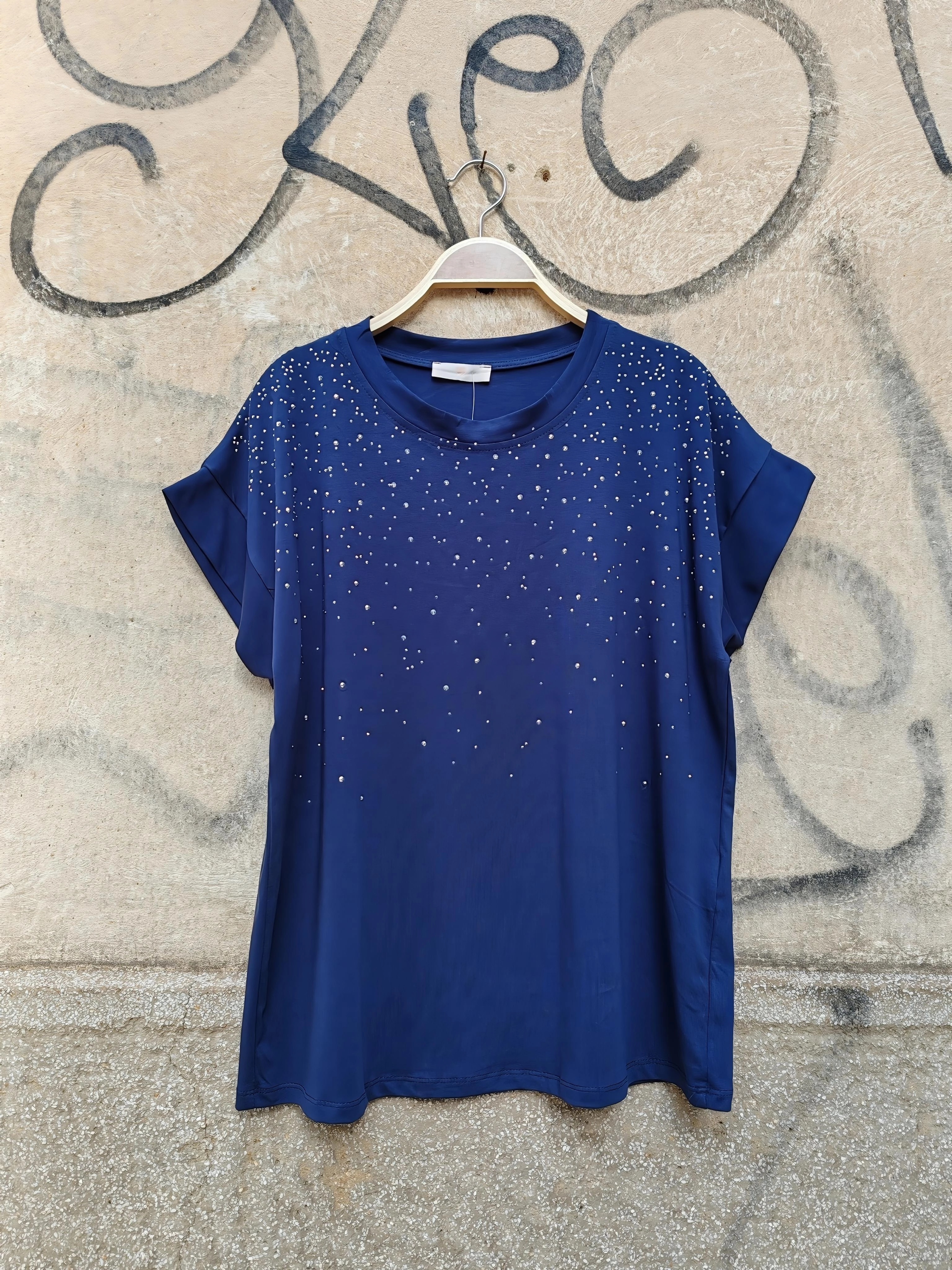 Το t-shirt Galaxy είναι η ιδανική επιλογή για μοντέρνες, ανεπιτήδευτα κομψές εμφανίσεις. Σε μπλε απόχρωση, με διακριτικές στρας λεπτομέρειες που δημιουργούν φωτεινό εφέ, αυτό το top προσθέτει έναν αέρα πολυτέλειας ακόμα και στις πιο casual στιγμές. Κατασκευασμένο από βαμβακερό stonewashed ύφασμα με απαλή υφή, συνδυάζεται τέλεια με παντελόνια, jeans ή φούστες για ένα city chic look που ξεχωρίζει χωρίς υπερβολές.