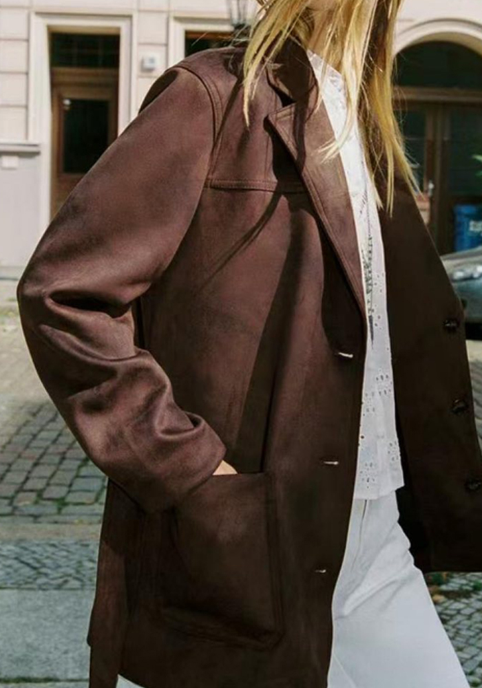 Το suede σακάκι Edith σε καφέ αποπνέει διαχρονική κομψότητα με μοντέρνα αισθητική. Κατασκευασμένο από ποιοτικό ύφασμα με suede αφή, διαθέτει ζώνη στη μέση που τονίζει τη σιλουέτα και δημιουργεί απόλυτα θηλυκή γραμμή. Οι εξωτερικές τσέπες και το καθαρό, minimal κόψιμο το καθιστούν ιδανικό για business looks αλλά και για smart casual εμφανίσεις.