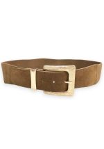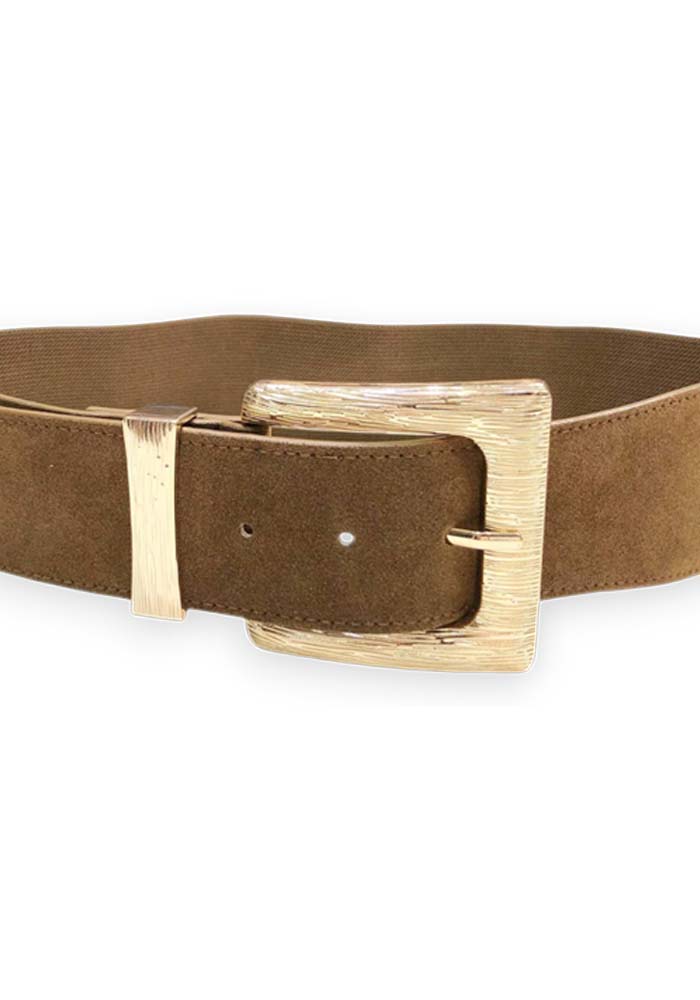 Κομψή ελαστική ζώνη Amy σε κάμελ απόχρωση με suede υφή, σχεδιασμένη για να προσδίδει δομή και πολυτέλεια σε κάθε σύνολο. Η εντυπωσιακή χρυσή μεταλλική αγκράφα με ανάγλυφο φινίρισμα λειτουργεί ως κεντρικό statement στοιχείο, προσφέροντας refined αισθητική και ισορροπία μεταξύ minimal και elegant γραμμής. Η ελαστική πίσω πλευρά εξασφαλίζει άνετη εφαρμογή και σταθερό κράτημα στη μέση, καθιστώντας τη ζώνη ιδανική για φορέματα, σακάκια, πουκάμισα ή tailored παντελόνια. Αποτελεί ευέλικτο styling εργαλείο που αναβαθμίζει άμεσα τόσο καθημερινά όσο και πιο formal looks.