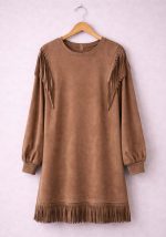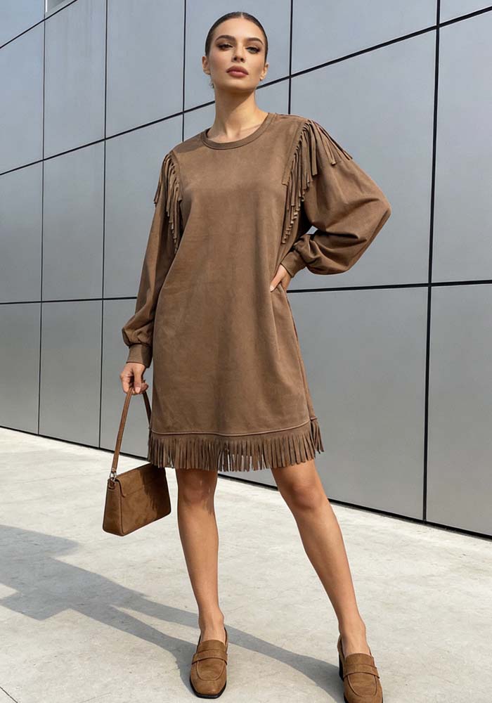 Αναδείξτε το στυλ σας με αυτό το εντυπωσιακό mini φόρεμα Gabby σε καφέ χρώμα με διακοσμητικά κρόσσια, που συνδυάζει σύγχρονη αισθητική και θηλυκή κίνηση. Η απαλή, suede υφή προσφέρει πολυτελή αίσθηση στην αφή, ενώ τα κρόσσια στους ώμους και στο τελείωμα δημιουργούν δυναμικό αποτέλεσμα σε κάθε σας βήμα. Η άνετη γραμμή και τα μακριά μανίκια με ελαφρύ όγκο καθιστούν το φόρεμα ιδανικό τόσο για day looks όσο και για βραδινές εμφανίσεις. Συνδυάζεται εύκολα με loafers, ankle boots ή ψηλοτάκουνα για fashion-forward styling.