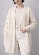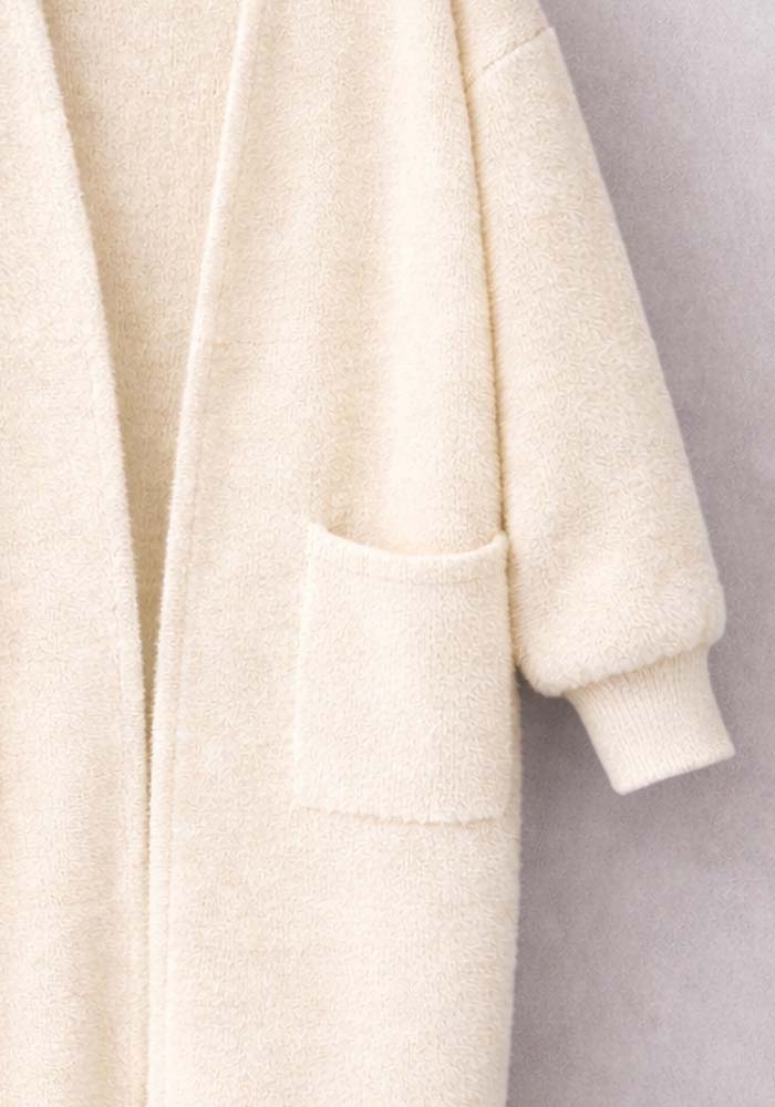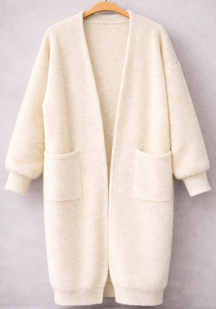 Ζακέτα πλεκτή τύπου cardigan Fluff σε εκρού χρώμα, ιδανική για καθημερινές αλλά και πιο προσεγμένες εμφανίσεις. Ο ανοιχτός σχεδιασμός χωρίς κουμπιά προσφέρει άνεση και ευελιξία στο styling, ενώ οι πρακτικές μπροστινές τσέπες προσθέτουν λειτουργικότητα. Ένα διαχρονικό κομμάτι που συνδυάζεται εύκολα με φορέματα, παντελόνια ή jeans, ιδανικό για όλες τις ώρες της ημέρας.