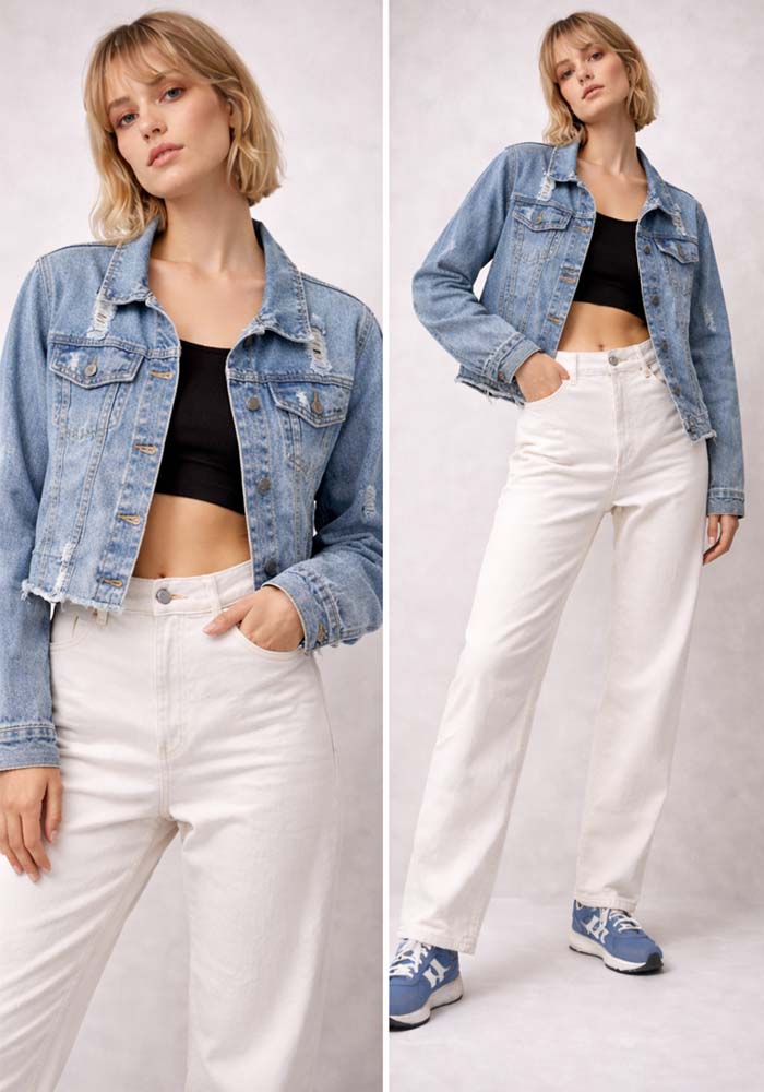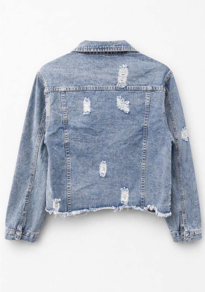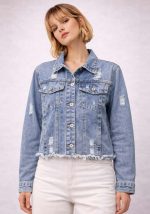 Γυναικείο denim jacket Ready σε κλασική medium blue απόχρωση με έντονα distressed στοιχεία, σχεδιασμένο για σύγχρονα casual και street style looks. Η γραμμή του είναι ελαφρώς χαλαρή, επιτρέποντας layering και ευελιξία στο styling, ενώ το cropped μήκος με ξεφτισμένο τελείωμα προσδίδει fashion-forward χαρακτήρα. Οι φθορές σε μπροστινό και πίσω μέρος δημιουργούν δυναμική αισθητική, χωρίς να υπερφορτώνουν το σχέδιο. Διαθέτει κλασικό γιακά, μεταλλικά κουμπιά και λειτουργικές τσέπες στο στήθος, διατηρώντας τη διαχρονική denim ταυτότητα. Αποτελεί βασικό statement κομμάτι για all-season χρήση – ιδανικό για συνδυασμό με φορέματα, basic tops ή total denim σύνολα.