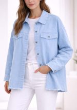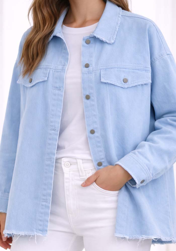 Γυναικείο βαμβακερό jacket Distressed σε σιέλ απόχρωση, σχεδιασμένο σε σύγχρονη overshirt γραμμή με raw τελειώματα που προσδίδουν μοντέρνο, casual χαρακτήρα. Διαθέτει κλασικό γιακά, μεταλλικά κουμπιά κατά μήκος, δύο τσέπες στήθους με καπάκι και ελαφρώς άνετη γραμμή για άνεση και ευελιξία στο styling. Η βαμβακερή του βάση με ελαστικότητα το καθιστά ιδανικό για layering σε μεταβατικές σεζόν. Ιδανικό για smart casual εμφανίσεις, city looks και effortless καθημερινό styling.