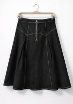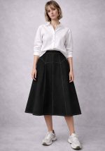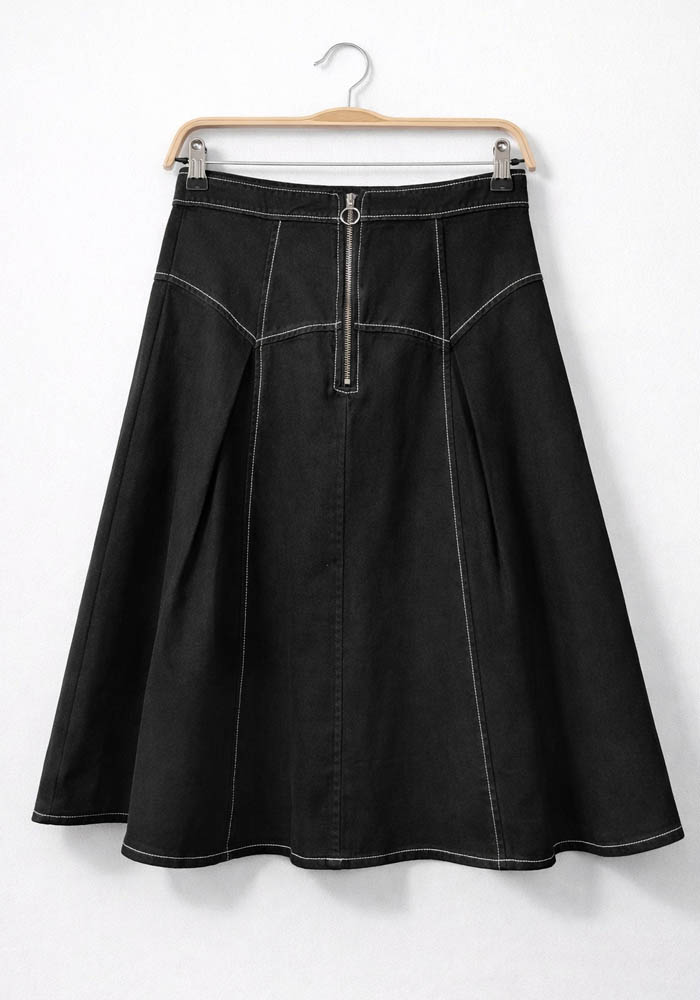 Μίντι φούστα Sports σε μαύρο από ανθεκτικό βαμβακερό τζην ύφασμα με δομημένη Α-line γραμμή που αναδεικνύει τη σιλουέτα και προσφέρει άνετη εφαρμογή. Διαθέτει μεταλλικό φερμουάρ πίσω με κρίκο puller, που προσθέτει μοντέρνο χαρακτήρα και πρακτικότητα στο styling. Οι κάθετες ραφές δημιουργούν οπτικό εφέ επιμήκυνσης, ενώ το σταθερό ύφασμα εξασφαλίζει άψογη φόρμα καθ’ όλη τη διάρκεια της ημέρας. Ιδανική επιλογή για καθημερινά city looks, office outfits αλλά και smart casual εμφανίσεις. Συνδυάζεται εύκολα με πλεκτά, πουκάμισα και cropped tops.