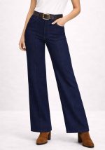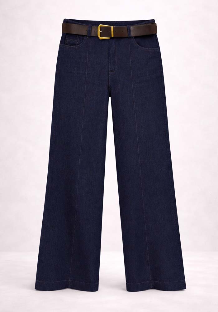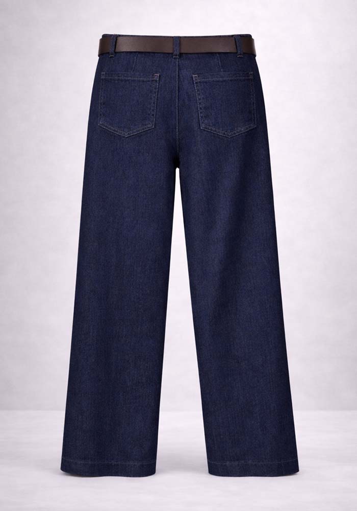 Denim παντελόνα Nervure σε σκούρα μπλε απόχρωση με wide leg γραμμή, σχεδιασμένη για σύγχρονες αλλά και διαχρονικές εμφανίσεις. Η ψηλόμεση εφαρμογή αναδεικνύει τη μέση, ενώ η φαρδιά γραμμή προσφέρει άνεση και κομψή κίνηση. Οι διακριτικές ραφές κατά μήκος του ποδιού ενισχύουν τη structured αισθητική, ενώ η ζώνη σε καφέ απόχρωση προσθέτει αντίθεση και ολοκληρώνει το look. Το denim ύφασμα προσφέρει σταθερότητα στη γραμμή, καθιστώντας το ιδανικό για καθημερινές αλλά και πιο προσεγμένες εμφανίσεις. Αποτελεί versatile κομμάτι που συνδυάζεται εύκολα με πουκάμισα, tops ή πλεκτά για casual chic styling.