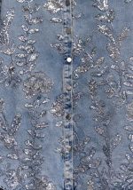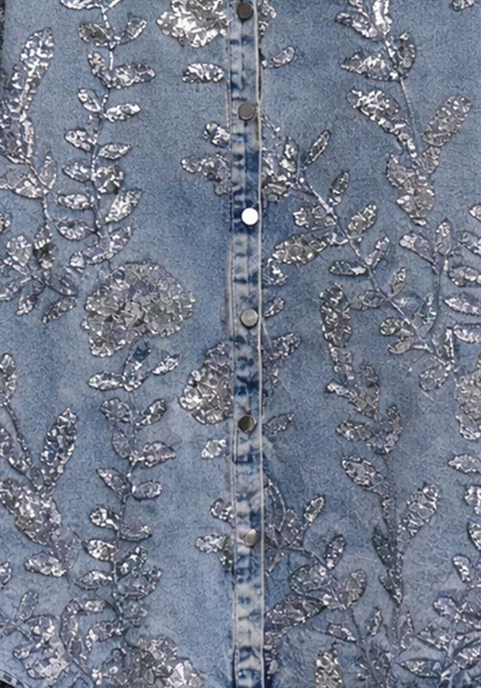 Γυναικείο denim πουκάμισο Precious με εντυπωσιακό κεντημένο ανάγλυφο floral σχέδιο και διακριτικό shimmer φινίρισμα, που προσδίδει πολυτελή χαρακτήρα στο κλασικό τζιν ύφος. Η άνετη γραμμή και το μαλακό denim ύφασμα προσφέρουν άνεση στην καθημερινή χρήση, ενώ το μεταλλικό κουμπί και οι καθαρές ραφές ολοκληρώνουν το premium αποτέλεσμα. Ιδανικό για fashion layering, μπορεί να φορεθεί είτε ως πουκάμισο είτε ως ελαφρύ jacket πάνω από tops και φορέματα. Ένα statement item που αναβαθμίζει άμεσα κάθε urban ή casual chic outfit.Κατάλληλο για city looks, smart casual εμφανίσεις και σύγχρονο καθημερινό styling.