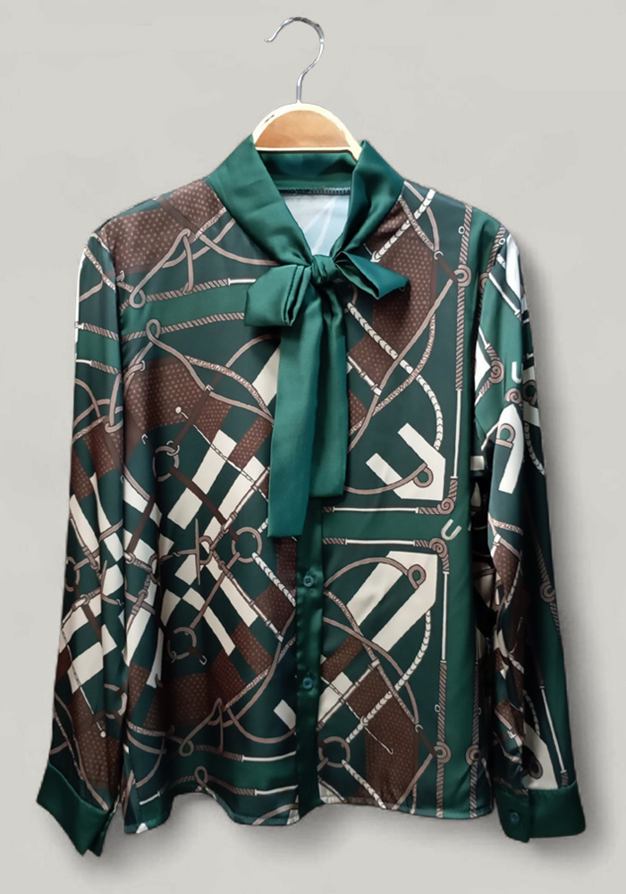 Το πουκάμισο Bow belts με φιόγκο αποτελεί ένα κομψό κομμάτι που αποπνέει διαχρονική φινέτσα και επαγγελματικό στυλ. Η σατινέ του υφή προσφέρει πολυτελή αίσθηση, ενώ το σχέδιο με μοτίβο “scarf print” σε αποχρώσεις πράσινου και μπεζ δημιουργεί ένα εντυπωσιακό αποτέλεσμα. Ο φιόγκος στο λαιμό χαρίζει θηλυκότητα και μπορεί να δεθεί με διάφορους τρόπους – ιδανικό για office looks ή πιο επίσημες εμφανίσεις. Συνδυάζεται άψογα με παντελόνια cigarette, φούστες midi ή υφασμάτινα culottes.