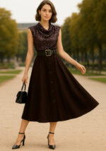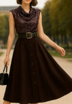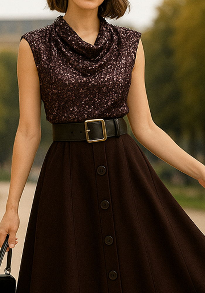 Το καφέ φόρεμα Jolie συνδυάζει δύο αισθητικές σε ένα statement κομμάτι: ένα glossy παγιετέ top με structured λαιμόκοψη και μία A-line midi φούστα με διακριτική κίνηση και clean κουμπιά καθ’ όλο το μήκος. Η ζώνη τονίζει τη μέση, διαμορφώνοντας μία ισορροπημένη, κομψή σιλουέτα που αποπνέει διαχρονικότητα και υψηλή αισθητική. Το φόρεμα αποδίδει ένα polished, elegant look ιδανικό για επίσημες περιστάσεις, βραδινές εξόδους, cocktail εμφανίσεις ή premium city events. Η παγιέτα προσφέρει controlled λάμψη, ενώ η midi φούστα εξασφαλίζει άνετη κίνηση και refined χαρακτήρα. Ένα versatile investment piece που ενισχύει το προσωπικό στιλ της σύγχρονης γυναίκας.
