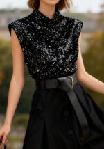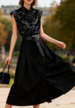 Το μαύρο φόρεμα Jolie συνδυάζει δύο αισθητικές σε ένα statement κομμάτι: ένα glossy παγιετέ top με structured λαιμόκοψη και μία A-line midi φούστα με διακριτική κίνηση και clean κουμπιά καθ’ όλο το μήκος. Η ζώνη τονίζει τη μέση, διαμορφώνοντας μία ισορροπημένη, κομψή σιλουέτα που αποπνέει διαχρονικότητα και υψηλή αισθητική. Το φόρεμα αποδίδει ένα polished, elegant look ιδανικό για επίσημες περιστάσεις, βραδινές εξόδους, cocktail εμφανίσεις ή premium city events. Η παγιέτα προσφέρει controlled λάμψη, ενώ η midi φούστα εξασφαλίζει άνετη κίνηση και refined χαρακτήρα. Ένα versatile investment piece που ενισχύει το προσωπικό στιλ της σύγχρονης γυναίκας.