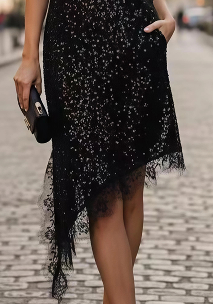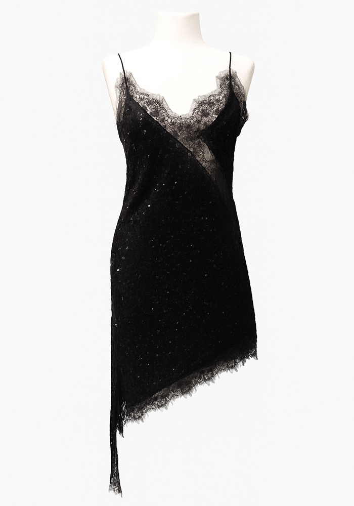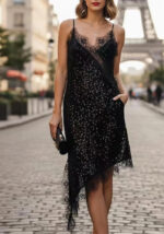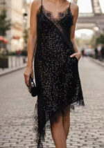 Το party φόρεμα Rogers σε μαύρο βελούδο με παγιέτες, αποτελεί την επιτομή της βραδινής κομψότητας με γαλλική φινέτσα. Σχεδιασμένο σε μαύρη βάση με λεπτή δαντέλα και διακριτική λάμψη, προσφέρει μια αίσθηση πολυτέλειας που δεν περνά απαρατήρητη.Η asymmetric γραμμή και οι λεπτές τιράντες προσδίδουν αέρινη κίνηση, ενώ το delicate ντεκολτέ με δαντέλα αναδεικνύει τη θηλυκότητα με εκλεπτυσμένο τρόπο. Ένα φόρεμα ιδανικό για cocktail nights, επίσημα events ή γιορτινά δείπνα με statement λάμψη.